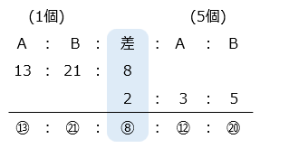 ⑬ – ⑫ = ① が消しゴム 4 個分の値段の比を表す。消しゴムを 7 個ずつ買ったときの A 子さんと B 子さんの残金の比は、