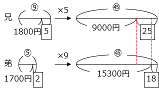 帽子の金額を ② とすると、靴の金額は ⑤ となる。兄と弟の最初の所持金はそれぞれ、⑤ + 1800、② + 1700 と表すことができ、その比が 9:5 である。よって、
