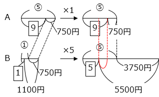 - 同じ個数を買うとき、残高の差は変わらないので、比の差をそろえる。