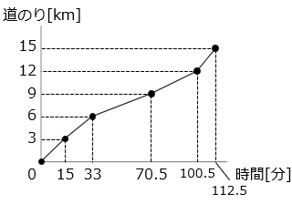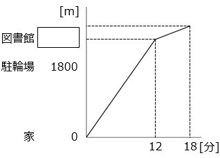 - グラフより、駐輪場から図書館に行くのにかかった時間は 18 – 12 = 6 [分] なので、駐輪場から図書館までは 40 × 6 = 240 [m]。よって、