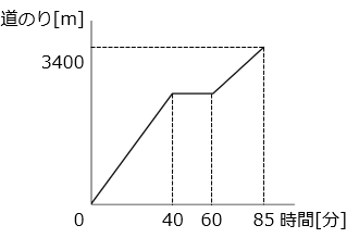(3)A さんは家から 3400 m 離れた映画館まで歩いて行きました。A さんは途中公園で 20 分休み、家を出てから 85 分後に映画館に着きました。公園で休んだ後の歩く速さは、休む前の速さの \(\dfrac{2}{3}\) です。グラフは、A さんが映画館に着くまでに、家から歩いた道のりを表したものです。