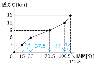 - グラフより、第 3 走者が 3 km走るのにかかった時間は 70.5 – 33 = 37.5 [分] = \(\dfrac{5}{8}\) [時間]。