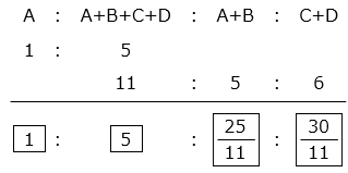 ① より仕事の速さの比は、A:B + C + D = \(\dfrac{1}{4}\):1 = 1:4 とわかる。