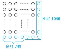 図のように、何個かのご石を、たて・横が同じ数になるように並べると、7 個あまりました。さらに、たて・横 1 列ずつ増やすには、あと 16 個足りません。ご石は全部で何個ですか。