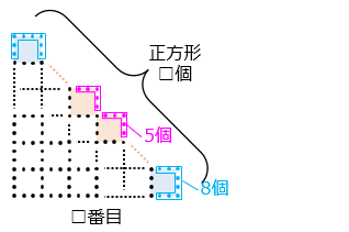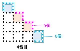 このとき、2 個の ■ 部分のご石はそれぞれ 8 個増え、( □ – 2 ) 個の ■ 部分のご石はそれぞれ 5 個増える。よって、次の式が成り立つ。