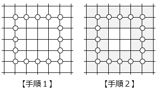 【手順1】正方形の 4 辺が方眼紙のたて横の線上にある正方形を一つ作り、その辺上のすべての格子点に白い石を置きます。