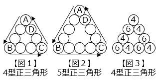 このようにしてできた正三角形について、一辺に □ 枚あるときは、「□ 型正三角形」と呼ぶことにします。
