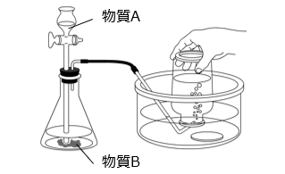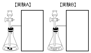 図は二酸化マンガンにうすい過酸化水素水を加えた実験 A と、石灰石にうすい塩酸を加えた実験 B の操作の様子で、どちらも気体を集めています。