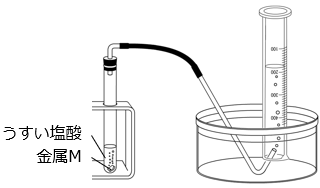 加えた塩酸の体積が 8 mL と 10 mL では発生する気体の体積が変わっていないことから、金属 M 0.5 g は塩酸 8 mL ですべて反応して無くなると考えられる。よって、それ以上の塩酸を加えても発生する気体の体積は変わらないので、