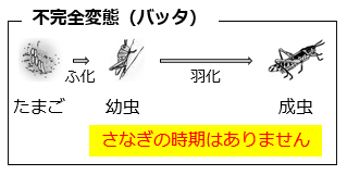 - イ:バッタは不完全変態をする昆虫なので、さなぎの時期はない