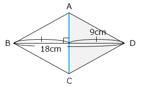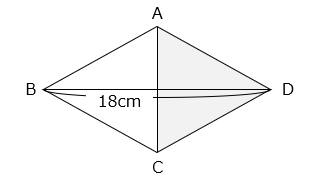 図の四角形は対角線 BD の長さが 18 cm のひし形です。対角線 AC より右側( の部分 )の面積は 45 cm2 です。