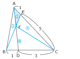 △AFB と △BFC は底辺が等しく、高さの比が 1:5 より △BFC = ② × 5 = ⑩ となる。