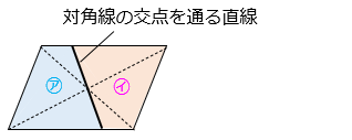※平行四辺形(正方形・長方形・ひし形を含む)を、対角線の交点を通る直線で 2 つに分割したとき、2 つの四角形の面積は等しい!