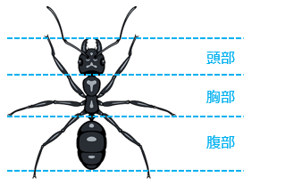 (1)昆虫類の体は、\(\boxed{ア}\) 部、\(\boxed{イ}\) 部、\(\boxed{ウ}\) 部の 3 つの部分に分かれています。足は \(\boxed{イ}\) 部に \(\boxed{エ}\) 本あります。