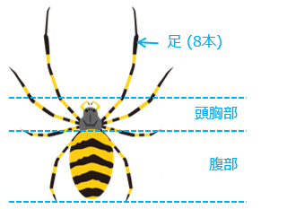 (2)クモ形類の体は、\(\boxed{ア}\) 部と \(\boxed{イ}\) 部の 2 つの部分に分かれています。\(\boxed{ア}\) 部とは、\(\boxed{ウ}\) 部と \(\boxed{エ}\) 部が一体になった部分です。足は \(\boxed{ア}\) 部に \(\boxed{オ}\) 本あります。