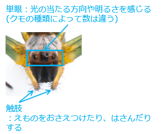 (3)クモの頭部には光の当たる方向や明るさを感じる \(\boxed{ア}\) や、えものをおさえつけたり、はさんだりする働きを持つ \(\boxed{イ}\) などがあります。