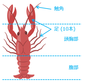 (4)こうかく類の体は、\(\boxed{ア}\) 部と \(\boxed{イ}\) 部の 2 つの部分に分かれています。足は \(\boxed{ア}\) 部に \(\boxed{ウ}\) 本あります。