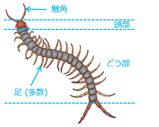 (5)多足類の体は、\(\boxed{ア}\) 部と \(\boxed{イ}\) 部の 2 つの部分に分かれています。\(\boxed{イ}\) 部とは、\(\boxed{ウ}\) 部と\(\boxed{エ}\) 部が一体になった部分です。\(\boxed{イ}\) 部に多数の対になる足があります。