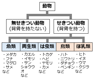 (2)せきつい動物は、\(\boxed{ア}\) 類、\(\boxed{イ}\) 類、\(\boxed{ウ}\) 類、\(\boxed{エ}\) 類、\(\boxed{オ}\) 類の 5 つのグループに分けることができます。