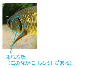 - えらは、水中で呼吸するための器官です。魚類の場合、泳ぎながら口から水をとり入れ、えらぶたから出しています。このときに、えらで水中の酸素をとりこみ、二酸化炭素を体外へ出しています。