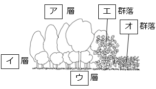 - ア:コケ イ:一年草 ウ:陽樹 エ:混交林 オ:陰樹 カ:極相