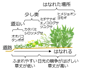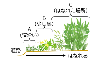 (3)身近な植物を観察すると、環境のちがいによっていろいろなすみ分けが見られます。図は道路近くの植物を表しています。