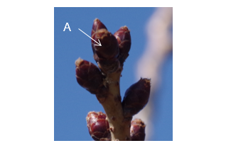 (1)ソメイヨシノは冬に葉が落ちた後、図の A をつけて冬を越します。A の名称を答えなさい。