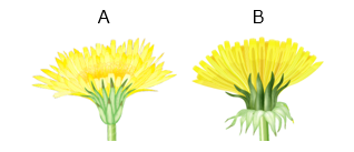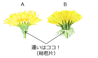 空き地でタンポポを観察したところ、A、B のように2つの種類がみられました。A、B のうち、一方はもともと日本でみられていたニホンタンポポです。もう一方はセイヨウタンポポで、明治時代に野菜として北海道に持ちこまれ、全国に広まっていったとされています。今では、ニホンタンポポをおしのけて、はびこるようになっています。