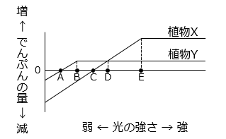 図は、植物 X と Y について、光の強さと一定時間のでんぷんの増減について調べたグラフです。