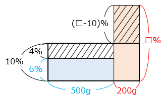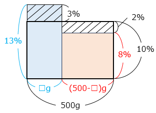 すべて 8 % の食塩水で 500 g 作ったとすると、食塩の量は 500 × 0.08 = 40 [g] となる。ただし、実際の食塩の量は 500 × 0.1 = 50 [g] である。