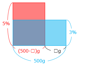 3 % の食塩水 500 g に含まれる食塩の量は、500 × 0.05 = 15 [g]