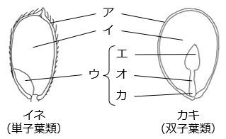 - ア:種皮 イ:胚乳 ウ:胚 エ:子葉 オ:胚軸 カ:幼根