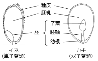 イネ、トウモロコシ、カキ ⇒ 有胚乳種子