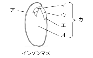 - ア:種皮 イ:幼芽 ウ:胚軸 エ:幼根 オ:子葉 カ:胚