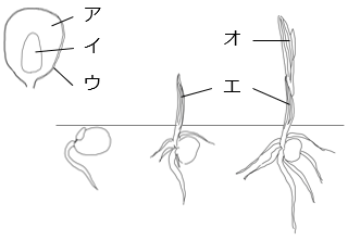 - ア:胚乳 イ:胚 ウ:種皮 エ:子葉 オ:本葉