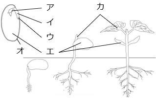 - ア:幼芽 イ:胚軸 ウ:幼根 エ:子葉 オ:種皮 カ:本葉
