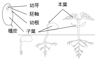 名称 はたらき 種皮 乾燥や寒さから内部を守る。 胚乳 有胚乳種子が養分をたくわえる。 胚 成長してから植物のからだになる。 子葉 はじめて出る葉。無胚乳種子が養分をたくわえる。 幼芽 成長して本葉や茎になる。 胚軸 成長して茎になる。 幼根 成長して根になる。