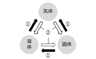 (3)図は、物質の状態と熱の出入りの関係をあらわしています。① と ② に当てはまる言葉として、正しい組み合わせを選びなさい。