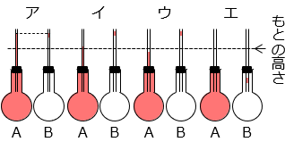 【実験 2】それぞれのフラスコを 50 ℃ のお湯に入れて、A の液面と B の赤インクの動きを見た。