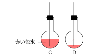 - フラスコ C、D ともに、フラスコ内の空気があたためられて、体積が大きくなり色水が押し出されてふき出す。元のフラスコ内の空気が C より多い D の方が、体積の変化が大きく、勢いよくふき出す。