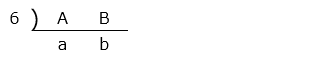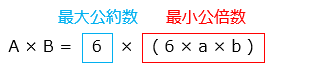 - 求める 2つの整数をそれぞれ A、B とし、A、B をそれぞれ最大公約数 6 で割った商を a、b ( a、b は互いに素 ) とする。これをすだれ算であらわすと、以下のようになる。